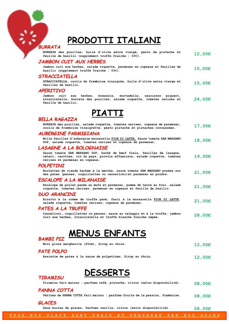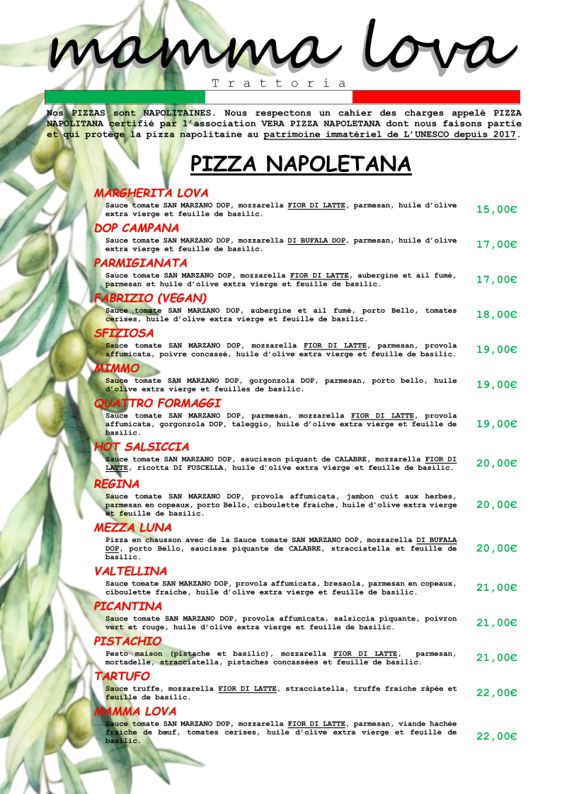 In conclusion, Mamma Lova Trattoria’s menu leaves a warm and memorable impression, offering a thoughtful selection of Italian classics with a creative twist. The Burrata stands out for its freshness and creamy texture, setting the tone for the quality of ingredients used throughout the menu. The Pizza Fritta is indulgent and comforting, while the N'drangheta Pizza delivers a bold, flavorful experience for those who enjoy a bit of spice. For something more refined, the Risotto À la Truffe d'été is rich and aromatic, showcasing the kitchen’s attention to balance and depth of flavor. The Pizza Pistachio adds a unique and slightly sweet contrast that works surprisingly well, highlighting the restaurant’s creativity. To finish, the Tiramisu Maison provides a classic, satisfying end to the meal, with just the right balance of coffee and cream. Overall, the menu reflects both tradition and originality, making it a place that feels authentic yet refreshingly modern.